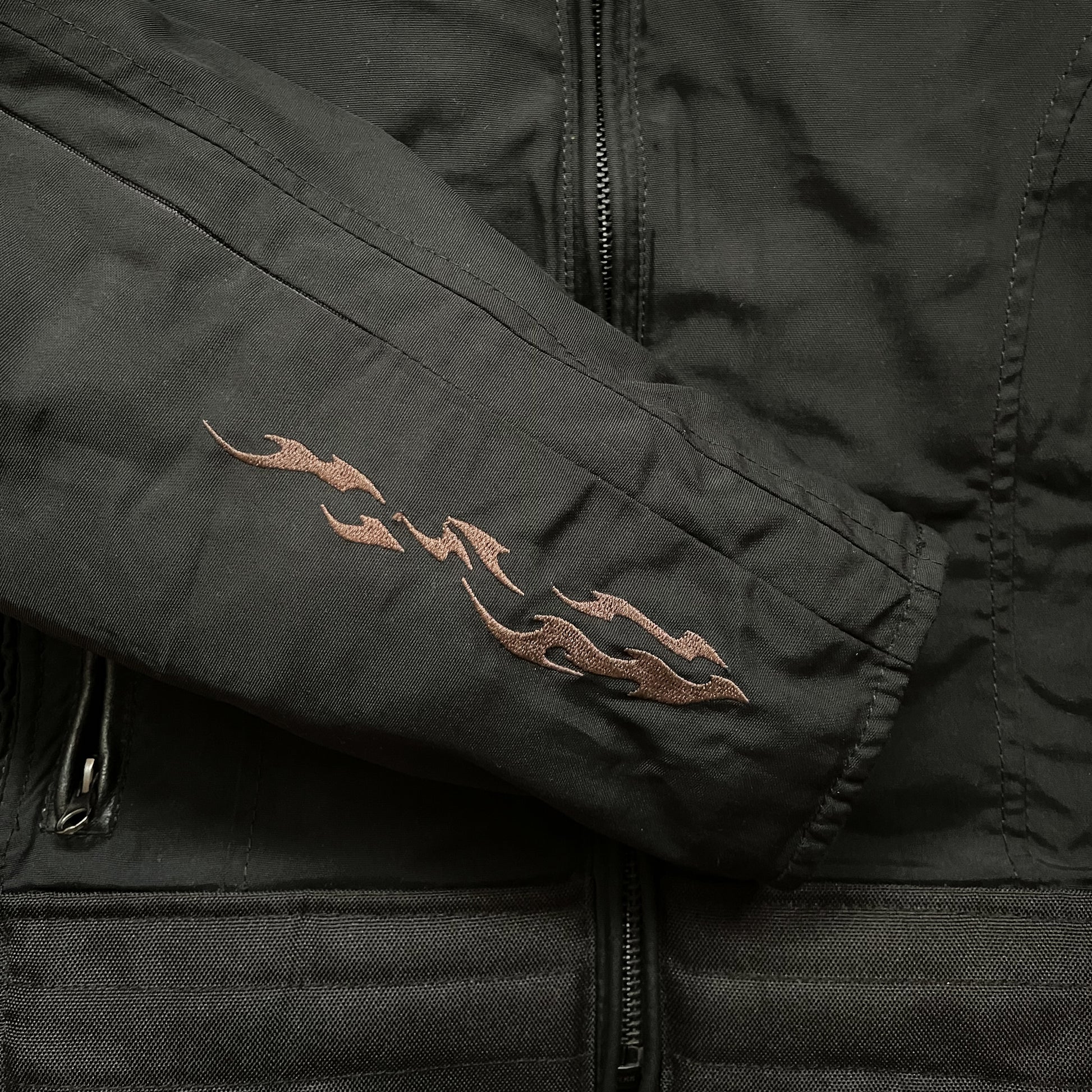- Flame embroidery on wrists
