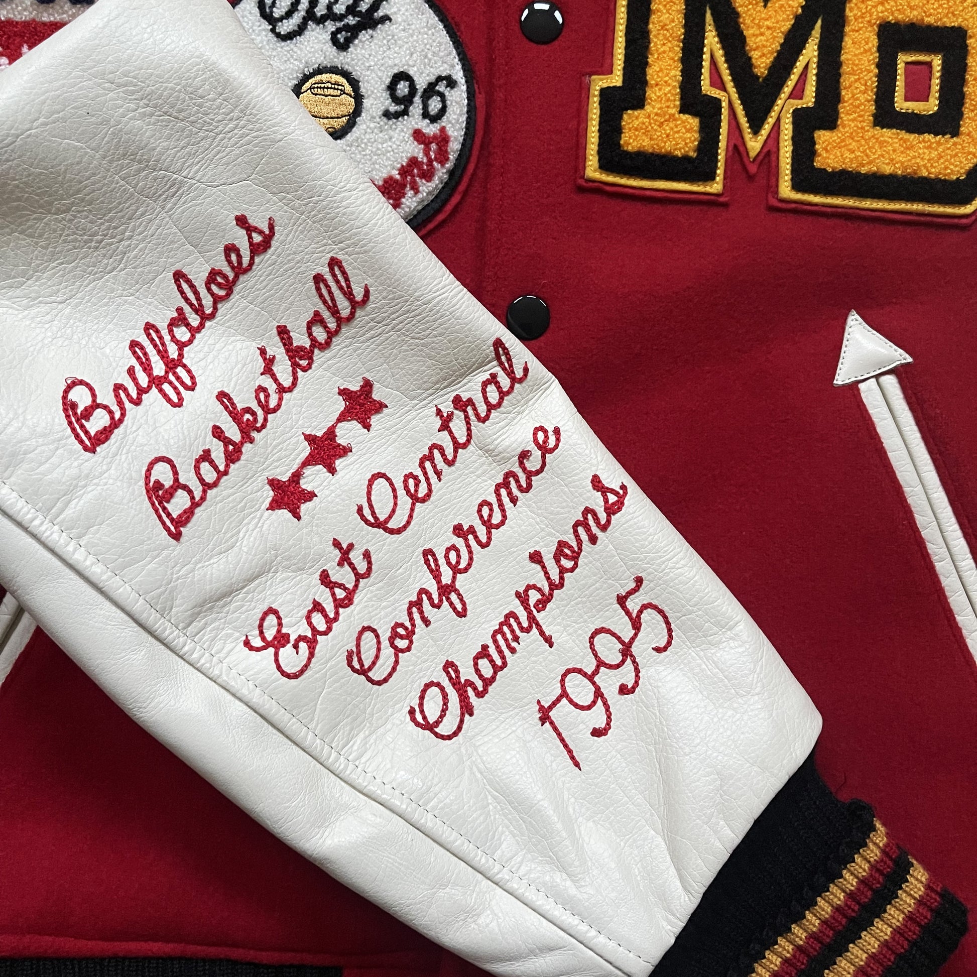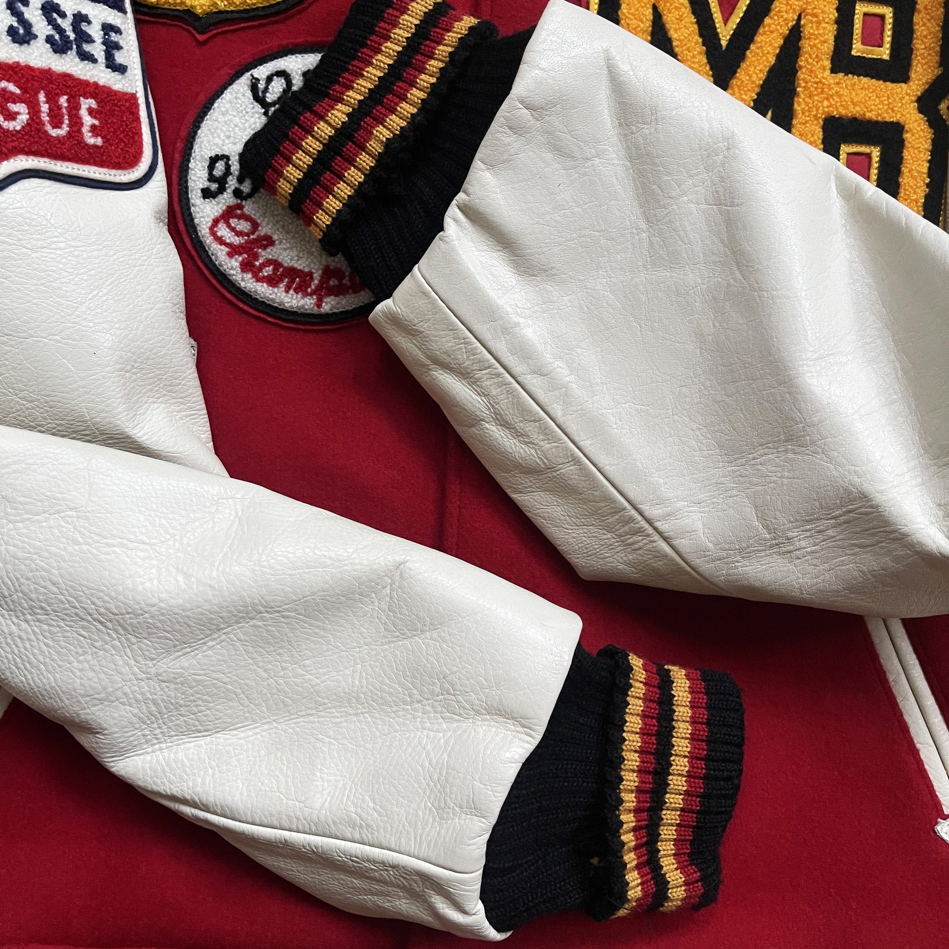 - Chenille patches and detailed embroidery